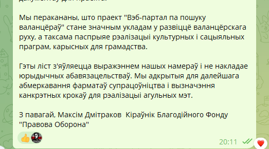 Благодійний Фонд "Правова Оборона" выказвае сваю шчырую зацікаўленасць у падтрымцы і ўдзеле ў вашым праекце "Вэб-партал па пошуку валанцёраў". Мы разумеем важнасць гэтага праекта ў фарміраванні эфектыўных каналаў для прыцягнення і каардынацыі валанцёраў, а таксама ў пашырэнні магчымасцей для рэалізацыі грамадска значных ініцыятыў.
